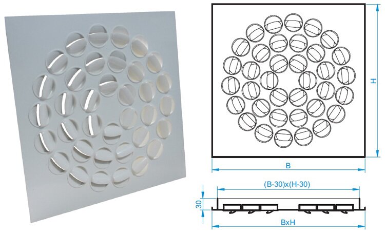 Решетки монтируются в подвесной потолок типа «Армстронг» и потолки других типов помещений различного назначения. За счет особенностей конструкции могут формировать струю от компактной до веерной и использоваться в помещениях с повышенными требованиями к воздухораспределению.