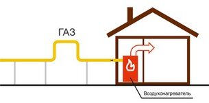 Для организации воздушного отопления с использованием магистрального природного газа используется газовый воздухонагреватель с воздушным теплообменником закрытого типа. Газовые воздухонагреватели могут быть стандартной эффективности с одним теплообменником или высокоэффективные с двумя теплообменниками. Коэффициент утилизации топлива у высокоэффективных воздухонагревателей более 94% — это означает, что 94% всей энергии, получаемой при сгорании газа, расходуется на нагрев воздуха. Для сравнения у стандартных водяных котлов этот показатель не превышает 60%.