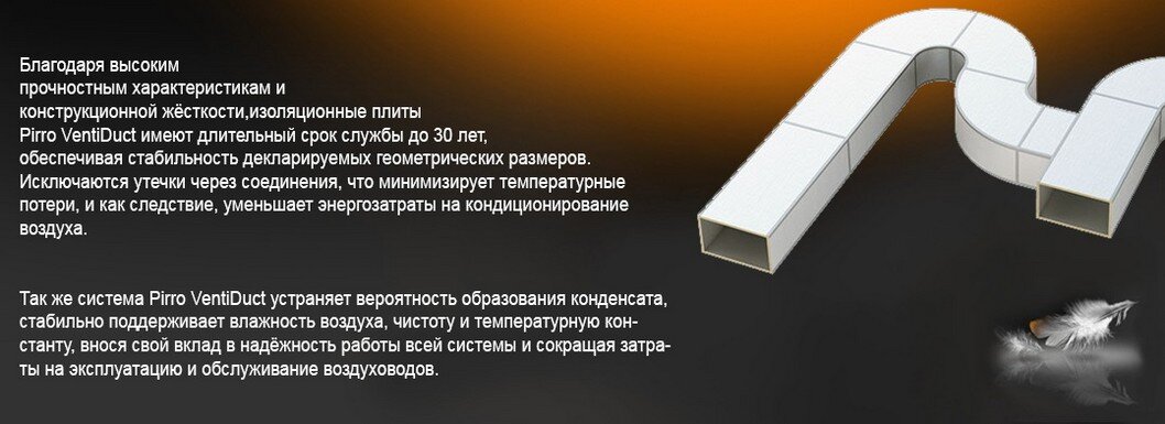 Pirro VentiDuct имеет целый ряд преимуществ по сравнению с жестяными воздуховодами. Благодаря им, вы сможите значительно ускорить скорость монтажа вентиляционных систем,уменьшить нагрузку на перекрытия, и добиться значительных экономических выгод.